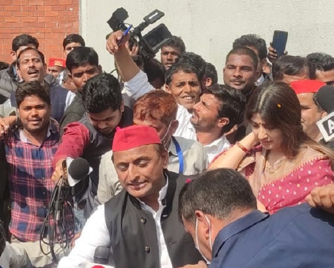 इटावा : चाचा शिवपाल और प्रो. रामगोपाल के बाद सैफई स्थित अभिनव विद्यालय में बने मतदान केंद्र पर समाजवादी पार्टी के राष्ट्रीय अध्यक्ष अखिलेश यादव वोट डालने पहुंचे तो समर्थकों ने घेर लिया। यहां पर उनके साथ पहली बार पूर्व सांसद पत्नी डिंपल यादव भी साथ में दिखाई दीं। अखिलेश और डिंपल ने बूथ पर जाकर मतदान किया।