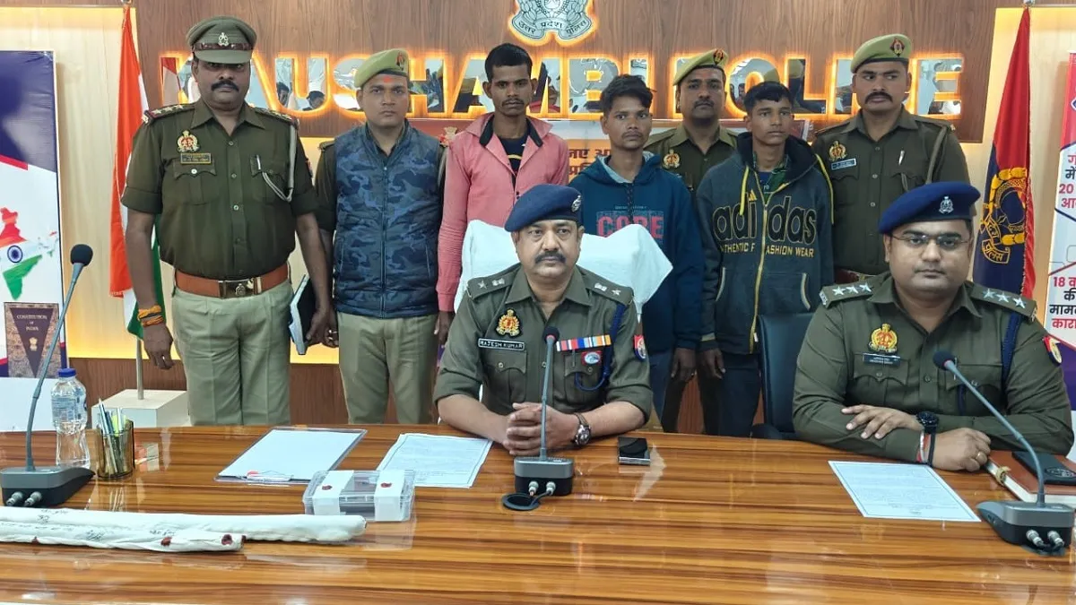 कौशांबी जिले में एक युवक की हत्या के आरोपित उसके दो सालों समेम तीन आरोपितों के साथ एसपी राजेश कुमार। सौजन्य : पुलिस मीडिया सेल