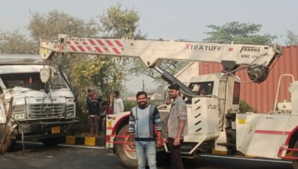 धुनवलिया स्थित फोरलेन पर दुर्घटनाग्रस्त वाहन को हटाता क्रेन। जागरण