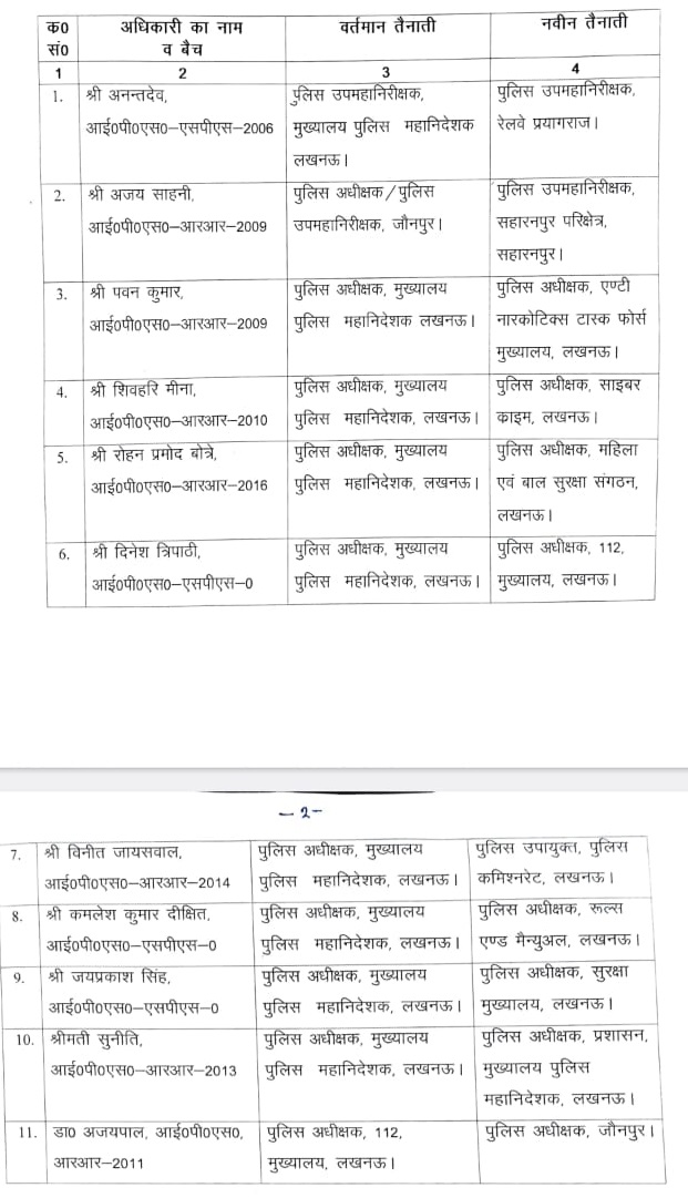 इसके अतिरिक्त रोहन प्रमोद बोत्रे को पुलिस अधीक्षक महिला एवं बाल सुरक्षा संगठन लखनऊ पर तैनाती दी गई है। दिनेश त्रिपाठी को पुलिस अधीक्षक 112 पर तैनात किया गया है। विनीत जयसवाल को पुलिस उपायुक्त पुलिस कमिश्नरेट लखनऊ, जय प्रकाश सिंह को पुलिस अधीक्षक सुरक्षा मुख्यालय लखनऊ और सुनीती को पुलिस अधीक्षक प्रशासन मुख्यालय बनाया गया है।