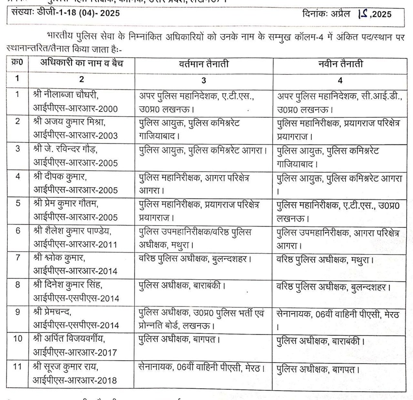 नीलाब्जा चौधरी को एडीजी एटीएस लखनऊ से एडीजी सीआइडी लखनऊ में तैनाती दी गई है। गाजियाबाद पुलिस कमिश्नरेट में कमिश्नर के पद पर तैनात अजय कुमार मिश्रा को पुलिस महानिरीक्षक प्रयागराज परिक्षेत्र में भेजा गया है।