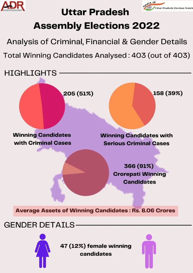 ADR ने पेश किया यूपी के नए विधायकों का रिपोर्ट कार्ड, इस बार 15% ज्यादा दागी बने विधायक; करोड़पति भी बढ़े