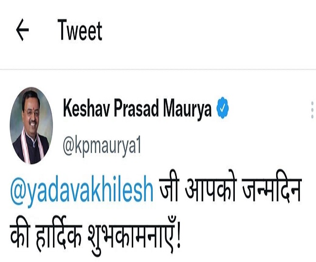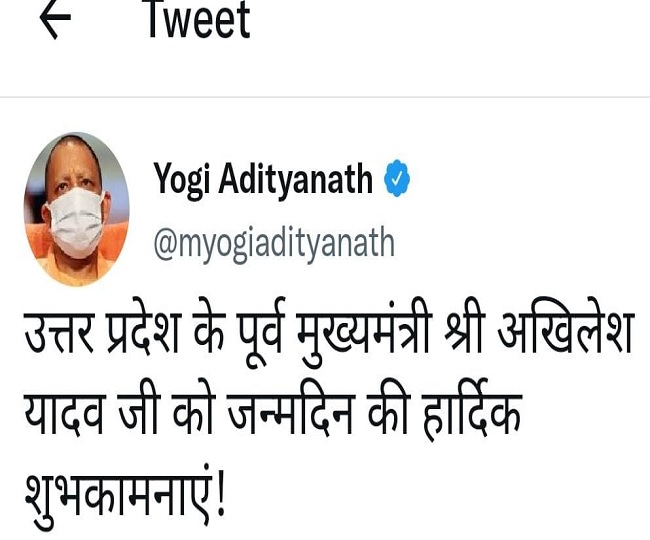 मुख्यमंत्री योगी आदित्यनाथ ने ट्वीट पर लिखा है कि उत्तर प्रदेश के पूर्व मुख्यमंत्री श्री अखिलेश यादव जी को जन्मदिन की हार्दिक शुभकामनाएं। उप मुख्यमंत्री केशव प्रसाद मौर्य ने भी अखिलेश यादव को जन्मदिन की बधाई का ट्वीट किया।