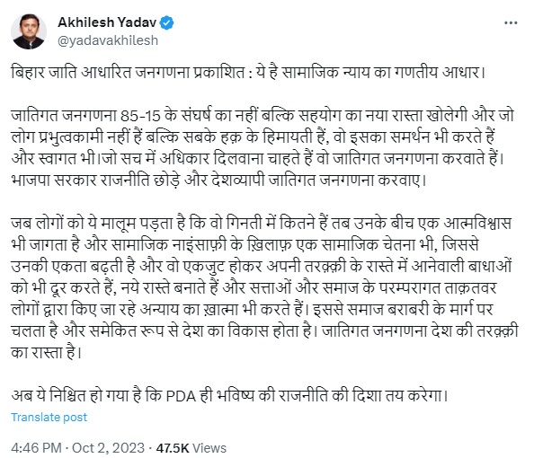 डिजिटल डेस्क, नई दिल्ली। बिहार सरकार द्वारा जातीय गणना की रिपोर्ट सार्वजनिक होने के बाद देश की राजनीति में एक नई बहस ने जन्म ले लिया है। उत्तर प्रदेश के पूर्व मुख्यमंत्री और समाजवादी पार्टी के मुखिया अखिलेश यादव ने इस विषय को नीतीश-तेजस्वी सरकार प्रशंसा करते हुए इसे सामाजिक न्याय का गणतीय आधार बताया और कहा कि जातिगत जनगणना देश की तरक्की का रास्ता है।