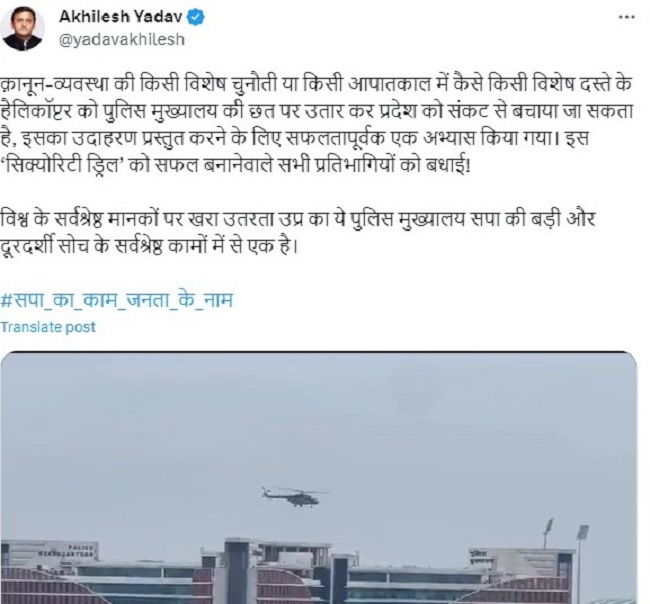 अखिलेश यादव ने लिखा कि क़ानून-व्यवस्था की किसी विशेष चुनौती या किसी आपातकाल में कैसे किसी विशेष दस्ते के हैलिकॉप्टर को पुलिस मुख्यालय की छत पर उतार कर प्रदेश को संकट से बचाया जा सकता है, इसका उदाहरण प्रस्तुत करने के लिए सफलतापूर्वक एक अभ्यास किया गया। इस ‘सिक्योरिटी ड्रिल’ को सफल बनानेवाले सभी प्रतिभागियों को बधाई!
