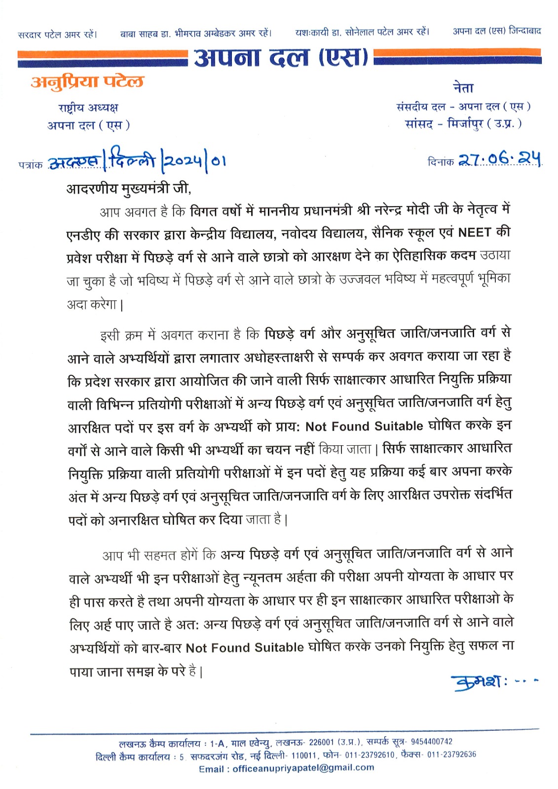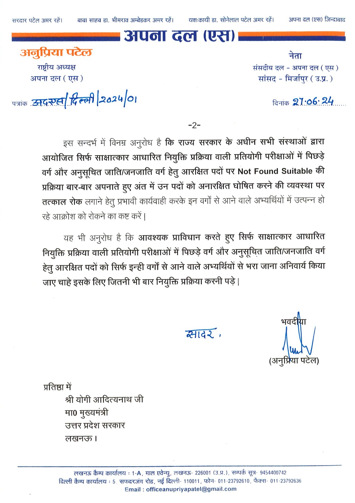 केंद्रीय मंत्री अनुप्रिया पटेल ने साक्षात्कार के आधार पर मिलने वाली नौकरियों में पिछड़े और दलितों की अनदेखी करने का मुद्दा उठाया है। उन्होंने लिखा कि प्रदेश सरकार की साक्षात्कार वाली नियुक्तियों में ओबीसी, अनुसूचित जाति और जनजाति के अभ्यर्थियों का चयन नहीं किया जाता है। उन्हें योग्य नहीं है (not found suitable) कहकर छांट दिया जाता है।