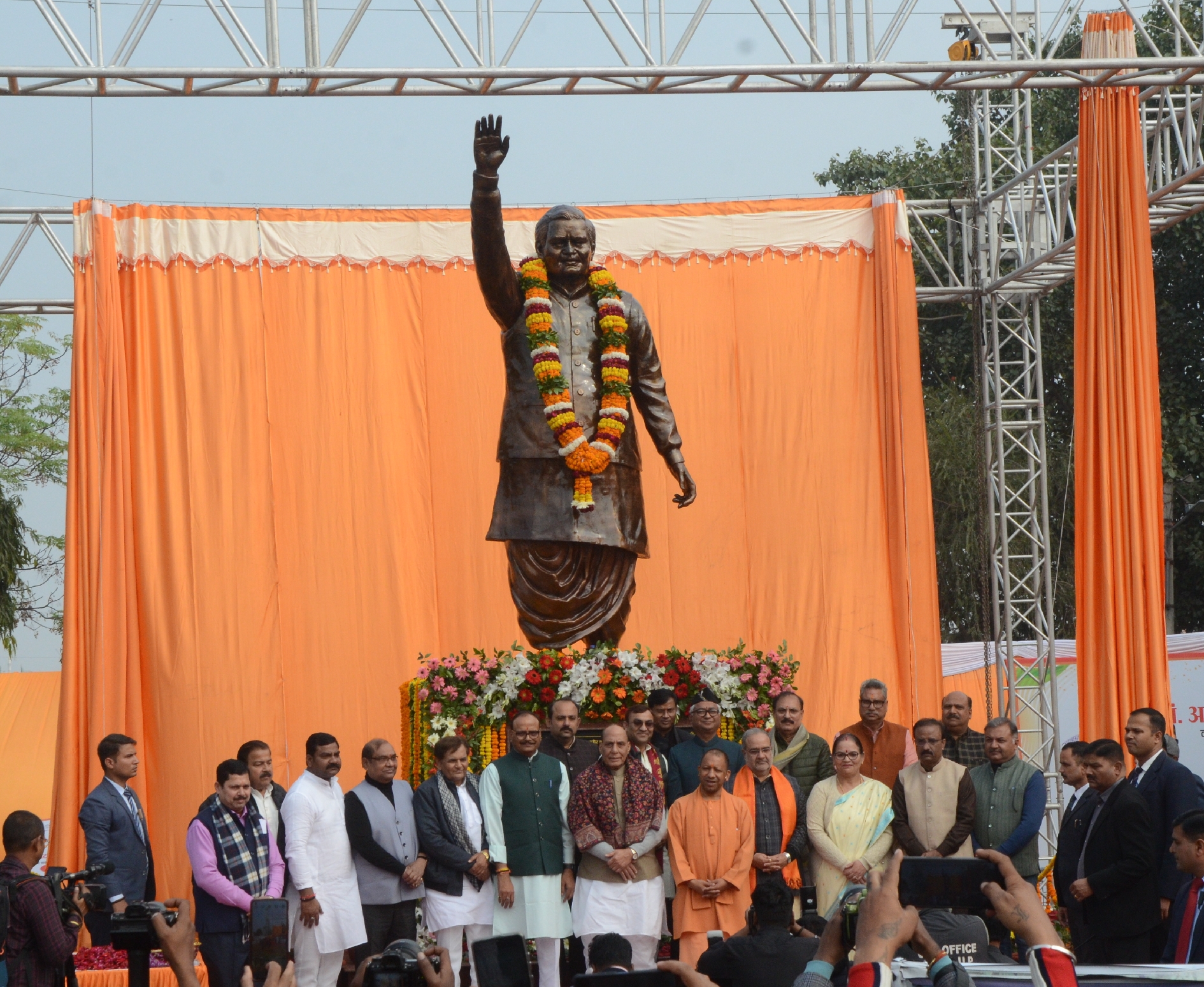रक्षा मंत्री राजनाथ सिंह व मुख्यमंत्री योगी आदित्यनाथ ने 'भारत रत्न' पूर्व प्रधानमंत्री अटल बिहारी वाजपेयी की प्रतिमा का अनावरण किया। यह प्रतिमा राजधानी लखनऊ में गोमती किनारे कुड़ियाघाट पर स्थापित की गई है। रक्षा मंत्री व मुख्यमंत्री ने प्रतिमा के रचनाकार अमरपाल सिंह को सम्मानित किया। रक्षा मंत्री राजनाथ सिंह ने अटल संकल्प की प्रतिज्ञा दिलाई।