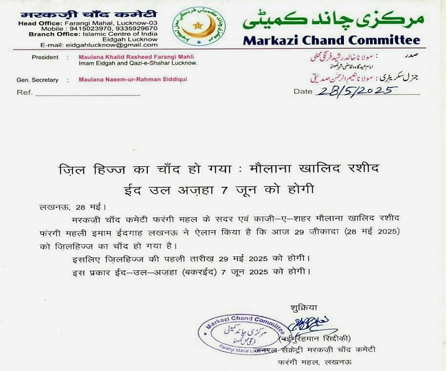 Bakrid 2025 Date Declared मरकजी सुन्नी चांद कमेटी के अध्यक्ष मौलाना खालिद रशीद फरंगी महली व शहर-ए-काजी मौलाना मुफ्ती अबुल इरफान मियां फरंगी महली ने भी चांद दिखने का एलान किया और सात जून को बकरीद होने की बात कही है। जिलहिज्ज महीने की पहली तारीख गुरुवार करे होगी और सात जून को बकरीद मनाई जाएगी।