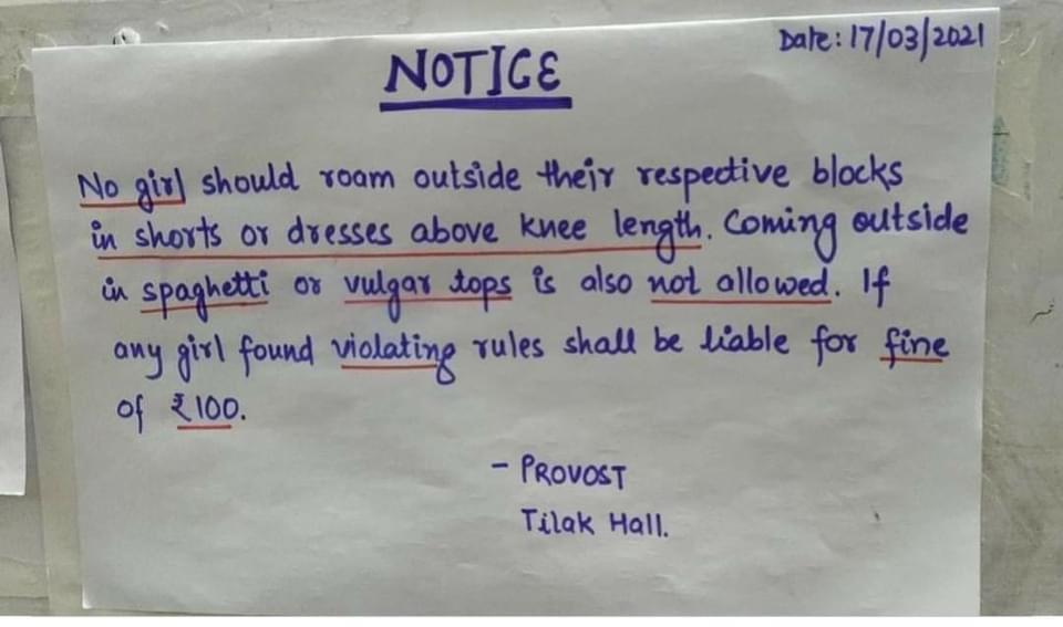 लखनऊ, जेएनएन। लखनऊ विश्वविद्यालय की ओर से हास्टल की छात्राओं के शॉर्ट ड्रेस पहनने पर पाबंदी और जुर्माना लगाने का आदेश गुरुवार को वायरल हो गया। इंटरनेट मीडिया पर प्रोवोस्ट के पदनाम से वायरल इस नोटिस में कहा गया कि तिलक महिला छात्रावास में घुटनों से ऊपर शार्ट ड्रेस या वल्गर टॉप पहनने पर पाबंदी होगी। ऐसे कपड़े पहनने वाली छात्रा पर सौ रुपये का जुर्माना लगेगा। यह नोटिस इंटरनेट मीडिया पर वायरल होते ही विवि में हड़कंप मच गया। छात्र भी इंटरनेट मीडिया पर विरोध में उतर आए। हालांकि, विवि प्रशासन ने इस नोटिस को पूरी तरह फर्जी बताया है।