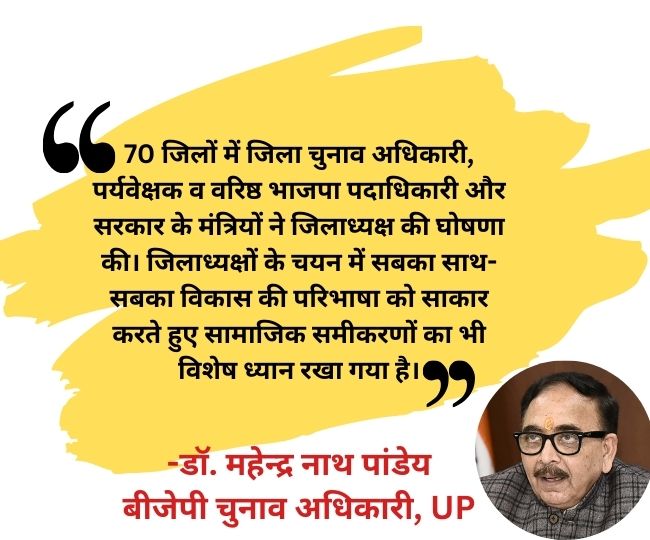 डॉ. पांडेय ने बताया कि प्रदेश के 70 जिलों में जिला चुनाव अधिकारी, पर्यवेक्षक व वरिष्ठ भाजपा पदाधिकारी और सरकार के मंत्रियों ने जिलाध्यक्ष की घोषणा की। जिलाध्यक्षों के चयन में सबका साथ-सबका विकास की परिभाषा को साकार करते हुए सामाजिक समीकरणों का भी विशेष ध्यान रखा गया है।