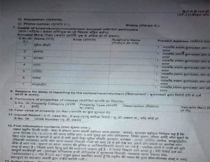 गोकशी मामले में दर्ज कराई गई एफआईआर में सात लोगों को नामजद किया गया है। इन सात में से छह नाम फर्जी हैं। सात लोगों के खिलाफ नामजद एफआईआर लिखी गई है। सभी नयाबांस गांव के हैं। सात में से दो नाबालिग बच्चे हैं तो बाकि पांच नाम कौन हैं पुलिस को भी पता नहीं है। शराफत (जिनका नाम एफआईआर में है) पिछले दस साल से गांव में रहते ही नहीं। वह फरीदाबाद में रहते हैं और कई वर्ष से गांव भी नहीं आए। बाकी तीन नाम सुदैफ, इलियास और परवेज इस गांव के नहीं हैं। न तो इनका यहां घर और न ही जमीन। गांव वालों ने इनका नाम पहले नहीं सुना। सर्फुद्दीन थाने गए हैं वो गांव के ही हैं। योगेश राज ने इस मामले में जिनके नाम मामला दर्ज कराया है उसमें सात में से छह नाम फर्जी हैं।