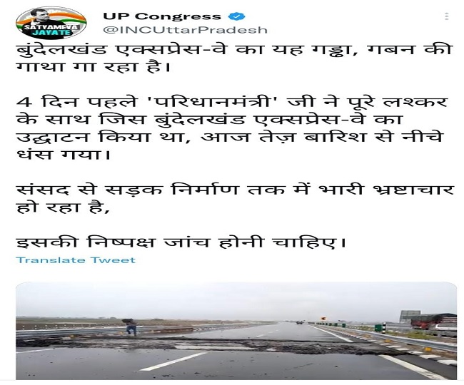 उत्तर प्रदेश कांग्रेस कमेटी ने भी इसको लेकर दो ट्वीट किया है। कहा गया है कि बुंदेलखंड एक्सप्रेस-वे का यह गड्ढा, गबन की गाथा गा रहा है। इसके साथ ही उत्तर प्रदेश कांग्रेस ने कहा कि चार दिन पहले परिधानमंत्री जी ने पूरे लश्कर के साथ जिस बुंदेलखंड एक्सप्रेस-वे का उद्घाटन किया था, आज तेज बारिश से नीचे धंस गया। संसद से सड़क निर्माण तक में भारी भ्रष्टाचार हो रहा है, इसकी निष्पक्ष जांच होनी चाहिए। क्या योगी आदित्यनाथ जी ठेके में कितना कमीशन चला है कि उद्घाटन के 4 रोज बाद ही एक्सप्रेस वे धंस गया। यूपीडा वाले तो मुख्यमंत्री जी के चहेते अधिकारी हैं।