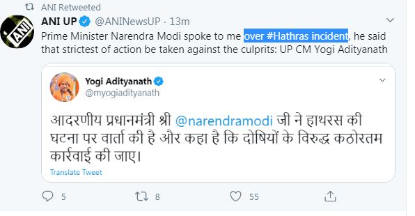लखनऊ, जेएनएन। हाथरस की घटना पर प्रधानमंत्री नरेंद्र मोदी ने उत्तर प्रदेश के मुख्यमंत्री योगी आदित्यनाथ को फोन किया और इस मामले में दोषियों पर कड़ी कार्रवाई करने का निर्देश दिया। प्रधानमंत्री की पहल की जानकारी खुद सीएम योगी आदित्यनाथ ने ही दी। उन्होंने ट्वीट कर कहा कि प्रधानमंत्री नरेंद्र मोदी जी ने हाथरस की घटना पर वार्ता की है और कहा है कि दोषियों के विरुद्ध कठोरतम कार्रवाई की जाए।