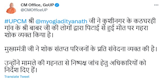 मुख्यमंत्री योगी आदित्यनाथ ने कुशीनगर में 20 मार्च की घटना के बाद रविवार रात बाबर की मौत पर गहरा दुख जताया है। सीएम योगी आदित्यनाथ ने कहा कि महात्मा बुद्ध का महापरिनिर्वाण स्थली कुशीनगर में बाबर की पिटाई का प्रकरण बेहद ही निंदनीय है। बाबर की पिटाई से मौत पर गहरा शोक व्यक्त करने के साथ मुख्यमंत्री ने शोक संतप्त परिजनों के प्रति संवेदना भी जताई। उन्होंने कुशीनगर के एसपी को इस प्रकरण की तत्काल तथा निष्पक्ष जांच के लिए निर्देश दिया है। इसके साथ ही शासन तथा पुलिस विभाग के आला अधिकारियों को जांच पर नजर रखने का निर्देश दिया है। बाबर कुशीनगर के कठघरही गांव के निवासी थे।