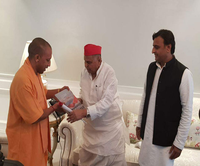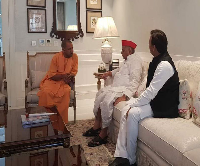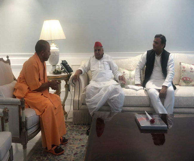 मुख्यमंत्री योगी आदित्यनाथ जब मुलायम सिंह यादव से भेंट करने पहुंचे तो उस समय उनके साथ आवास पर समाजवादी पार्टी के अध्यक्ष अखिलेश यादव भी थे।