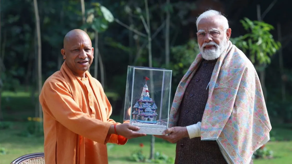 सीएम योगी ने पीएम मोदी को भेंट की गुलाबी मीनाकारी की श्रीराम मंदिर अनुकृति।
