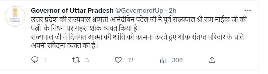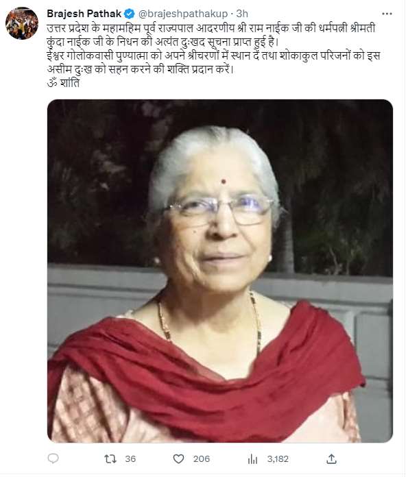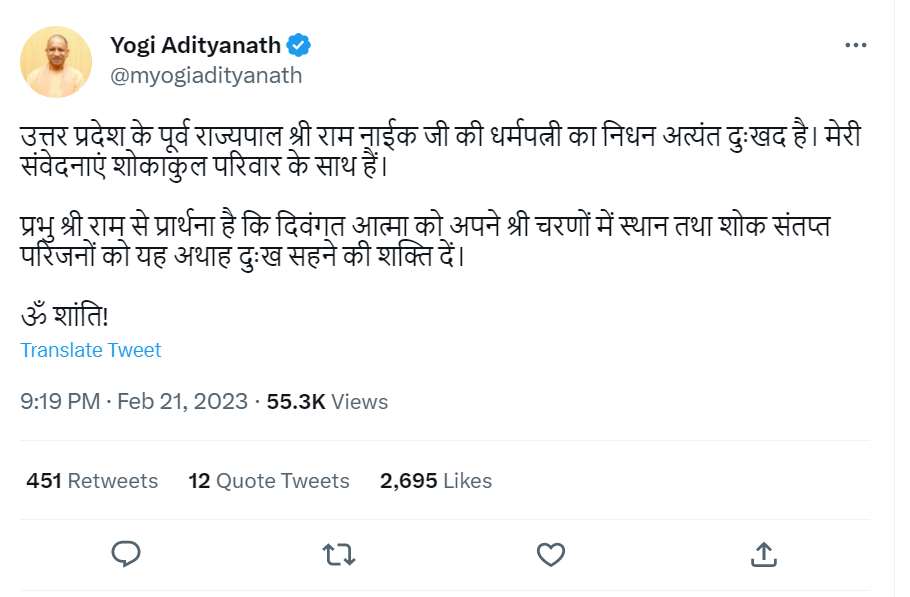 वहीं मुख्यमंत्री योगी आदित्यनाथ ने पूर्व राज्यपाल की पत्नी के निधन पर गहरा दुख जताया है। उन्होंने पूर्व राज्यपाल राम नाईक से फोन पर वार्ता की और उनकी पत्नी के निधन पर गहरी संवेदना प्रकट करते हुए परिवार को ढांढस बंधाया। इसके साथ उन्होंने ट्वीट भी किया है।