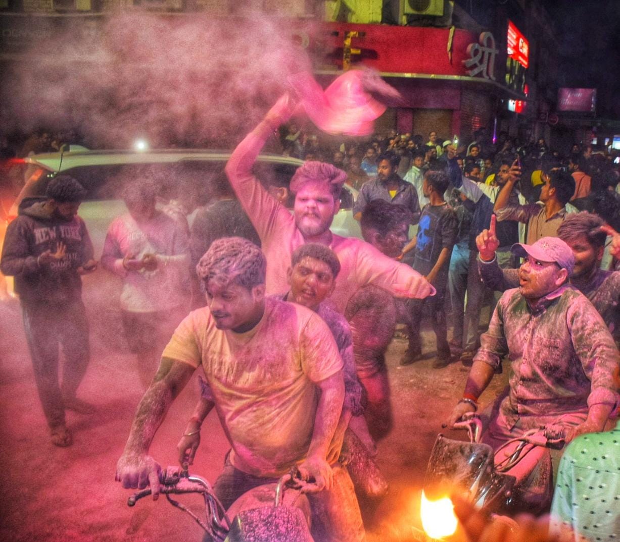 अलीगढ़ में आतिशबाजी हुई और गुलाल भी उड़ा।