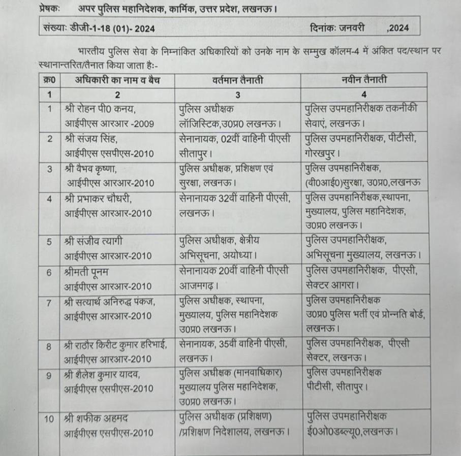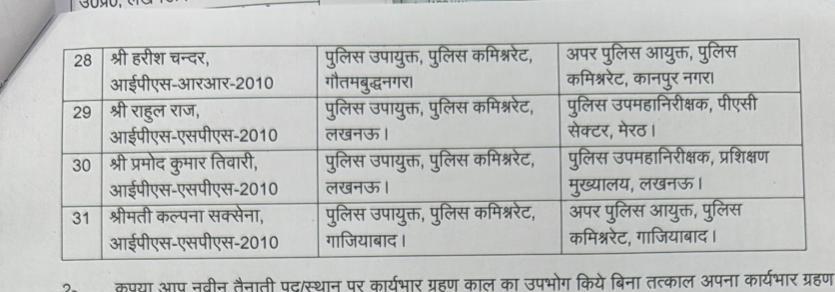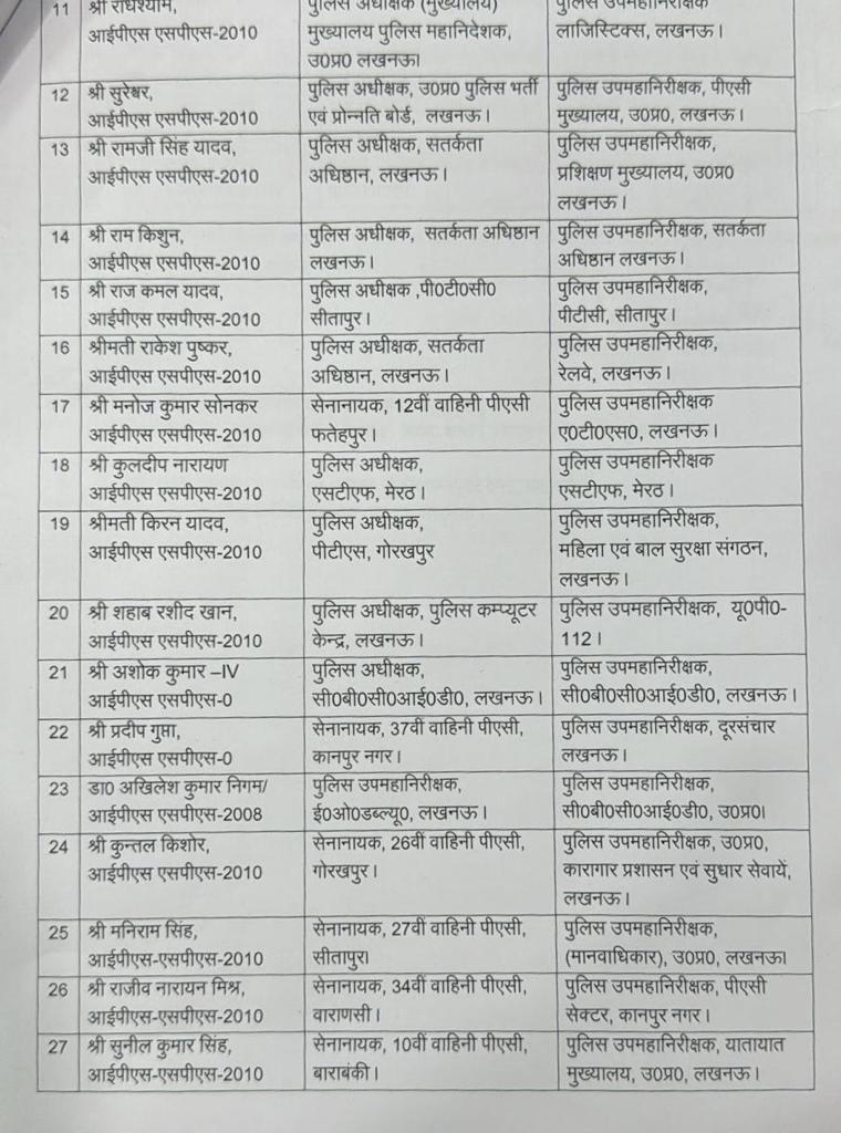 IPS Transfer List In UP शासन ने मंगलवार को पुलिस विभाग में बड़ा फेरबदल किया है। लखनऊ मेरठ गोरखपुर कई अन्य स्थानों पर तैनात 31 आईपीएस अधिकारियों का तबादले किए हैं। आईपीएस प्रभाकर चौधरी को पुलिस उपमहानिरीक्षक स्थापना मुख्यालय पुलिस महानिदेशक लखनऊ नियुक्त किया गया है। पुलिस अधीक्षक लॉजिस्टिक लखनऊ में तैनात आईपीएस अधिकारी रोहन पी. कनय को पुलिस उपमहानिरीक्षक तकनीकी सेवाएं लखनऊ नियुक्त किया गया है।