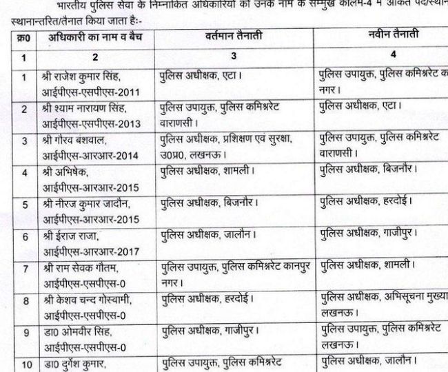 गौरव बंशवाल, पुलिस अधीक्षक, प्रशिक्षण एवं सुरक्षा लखनउ को वाराणसी में पुलिस उपायुक्त बनाया गया है। शामली के एसपी अभिषेक का तबादला एसपी बिजनौर के पद पर किया गया है। वहीं पुलिस अधीक्षक बिजनौर के पद पर तैनात नीरज कुमार जादौन को हरदाेई का एसपी बनाया गया है।