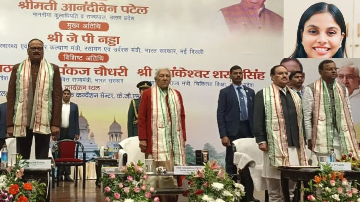 केजीएमयू के 21वें दीक्षा समारोह में (बाएं से) उप मुख्यमंत्री ब्रजेश पाठक, राज्यपाल आनंदी बेन पटेल, केंद्रीय स्वास्थ्य मंत्री जेपी नड्डा व भाजपा उत्तर प्रदेश अध्यक्ष पंकज चौधरी। इनसेट में तनुश्री सिंह