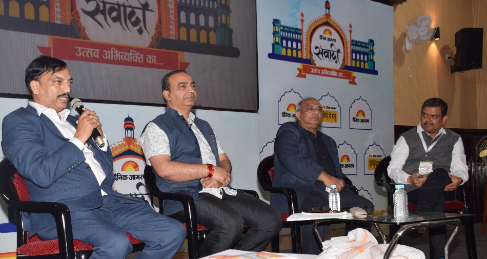 संवादी के सत्र संविधान और आरक्षण में बोलते शिक्षक धीरेन्द्र दोहरे साथ में संविधान विशेषज्ञ अश्विनी उपाध्याय, दलित चिंतक प्रो. विवेक कुमार व दैनिक जागरण मेरठ के समाचार संपादक रवि त्रिपाठी