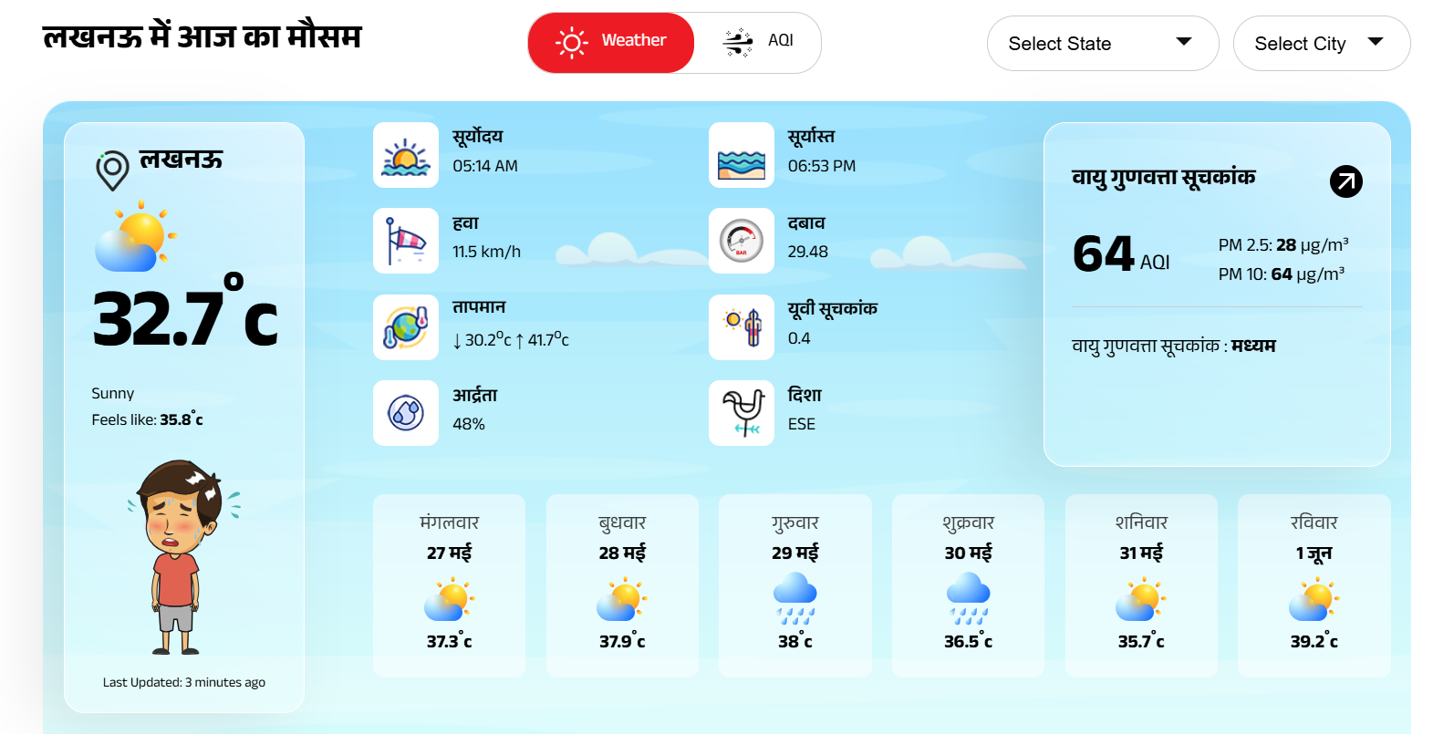 इसकी गति 30-40 किलोमीटर प्रतिघंटा रह सकती है। मंगलवार को प्रदेश में अधिकतम तापमान झांसी में सर्वाधिक 41.6 डिग्री सेल्सियस, जबकि उरई में 41 डिग्री सेल्सियस रहा। प्रदेश में न्यूनतम तापमान इटावा में सबसे कम 24.4 डिग्री सेल्सियस रहा। लखनऊ का अधिकतम तापमान 37.9 डिग्री सेल्सियस व न्यूनतम तापमान 27.2 डिग्री सेल्सियस रहा।