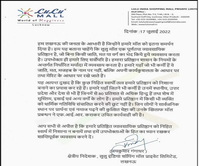 लुलु इंडिया शापिंग माल प्राइवेट लिमिटेड के क्षेत्रीय निदेशक जयकुमार गंगाधर ने बयान जारी किया है। इनमें बताया गया है कि लुलु माल पूर्ण रूप से व्यावसायिक प्रतिष्ठान है। यह बिना किसी जाति, धर्म, मत या फिर संप्रदाय का भेद किए बिना अपना व्यवसाय करता है। इसी तरह से हमारे प्रतिष्ठान में सभी कर्मियों को जाति, मत, मजहब या संप्रदाय के आधार पर नहीं बल्कि उनकी योग्यता, मेरिट, कार्यकुशलता तथा उनके अनुभव के आधार पर रखा जाता है। यह निहायत ही दुखद है कि कुछ स्वार्थी तत्व हमारे प्रतिष्ठान को निशाना बनाने के प्रयास में लगे हैं।