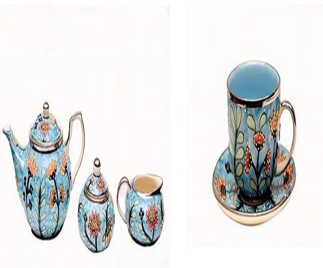यूके के पीएम बोरिस जॉनसन प्लेटिनम पेंटेड हैंड पेंटेड टी सेट गिफ्ट : पीएम मोदी ने ब्रिटेन के पीएम बोरिस जॉनसन को बुलंदशहर में बना प्लेटिनम पेंटेड हैंड पेंटेड टी सेट गिफ्ट किया। इसे बेस फॉर्म को हाथ से पेंट किया जाता है और 1200 डिग्री सेल्सियस पर निकाल दिया जाता है। इसमें उभरी हुई रूपरेखा मेहंदी कोन के काम से मैन्युअल रूप से रखी जाती है।