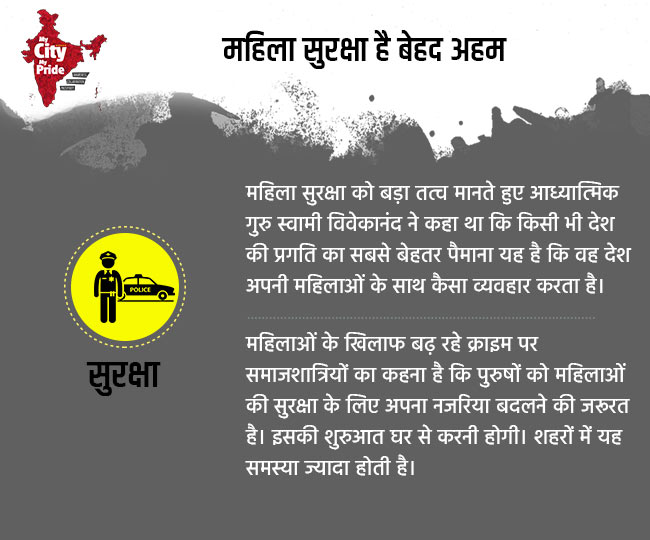 महिला सुरक्षा को बड़ा तत्व मानते हुए आध्यात्मिक गुरु स्वामी विवेकानंद ने कहा था कि किसी भी देश की प्रगति का सबसे बेहतर पैमाना यह है कि वह देश अपनी महिलाओं के साथ कैसा व्यवहार करता है। हालांकि देश में महिलाओं के खिलाफ काफी संख्या में अपराध देखे गए है।