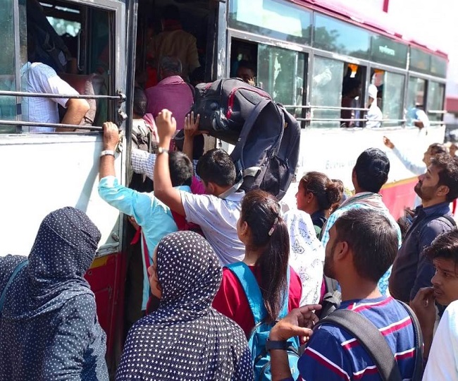 यूपी के प्रयागराज में PET 2022 की परीक्षा देने पहुंचे अभ्यर्थियों की भीड़ के चलते रोडवेज बसों में बैठने के लिए मारा-मारी मच गई है। सरकार ने छह हजार बसे पीईटी की परीक्षार्थियों के लिए उपलब्ध कराई हैं। ऐसे में आम जनता के लिए बसों में बैठने की भी जगह नहीं है। यह तस्वीर प्रयागराज की है।