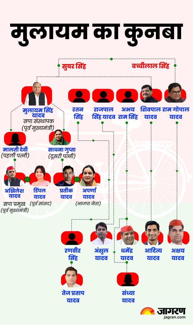 देश के असाधारण राजनेता के रूप में अपनी छवि बनाने वाले मुलायम सिंह यादव ने जमीनी राजनीति से शीर्ष तक अपना बड़ा मुकाम बनाया। उत्तर प्रदेश के साथ ही देश में समाजवादी के बड़े पुरोधा मुलायम सिंह यादव का कुनबा भी काफी बड़ा है।