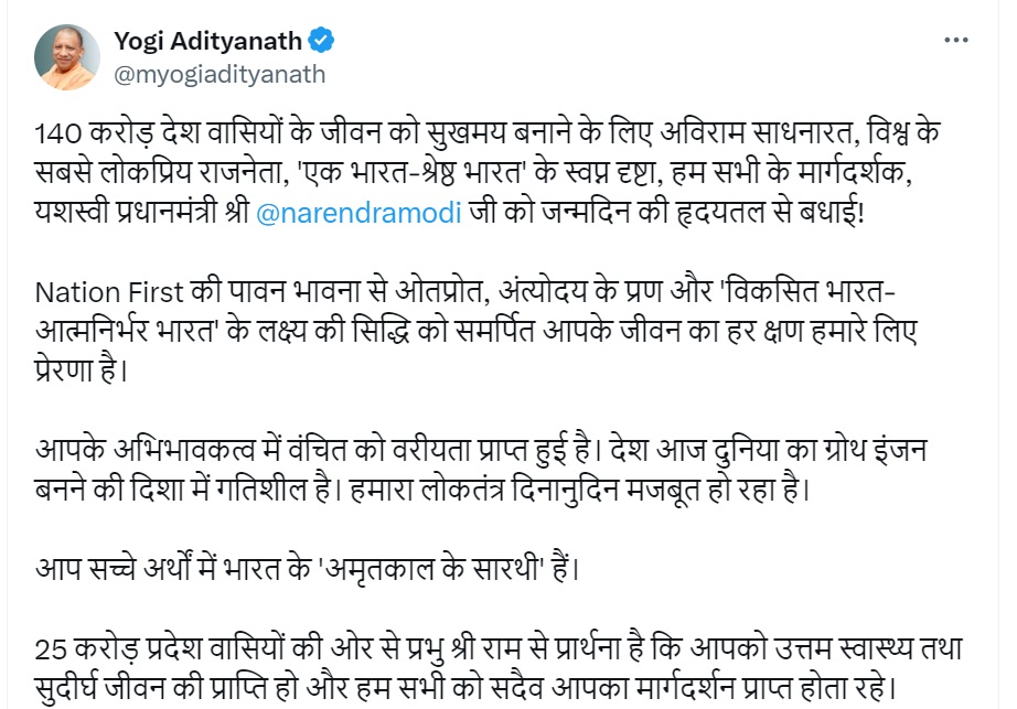 सीएम योगी ने आगे लिखा,"आप सच्चे अर्थों में भारत के 'अमृतकाल के सारथी' हैं। 25 करोड़ प्रदेश वासियों की ओर से प्रभु श्री राम से प्रार्थना है कि आपको उत्तम स्वास्थ्य तथा सुदीर्घ जीवन की प्राप्ति हो और हम सभी को सदैव आपका मार्गदर्शन प्राप्त होता रहे।"