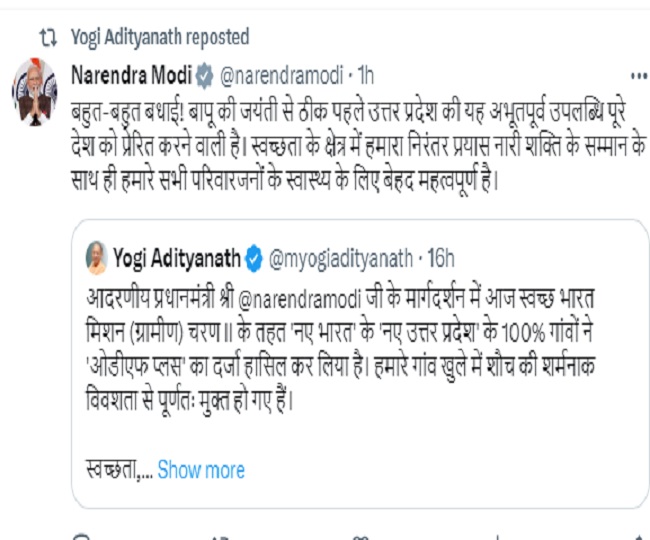 बहुत-बहुत बधाई! बापू की जयंती से ठीक पहले उत्तर प्रदेश की यह अभूतपूर्व उपलब्धि पूरे देश को प्रेरित करने वाली है। स्वच्छता के क्षेत्र में हमारा निरंतर प्रयास नारी शक्ति के सम्मान के साथ ही हमारे सभी परिवारजनों के स्वास्थ्य के लिए बेहद महत्वपूर्ण है।