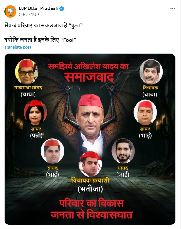 भारतीय जनता पार्टी ने बुधवार को सोशल मीडिया प्लेटफॉर्म एक्स (पहले ट्विटर) पर एक पोस्टर जारी किया। पोस्टर का शीर्षक दिया गया 'परिवार का विकास, जनता से विश्वासघात', इस पोस्टर के मध्य में अखिलेश यादव नजर आ रहे हैं, जबकि चारों तरफ मुलायम परिवार के अन्य सदस्य मौजूदा राजनीतिक पद के साथ दिखाई दे रहे हैं। पोस्टर के साथ लिखा गया सैफई परिवार का मकड़जाल है “फुल”, क्योंकि जनता है इनके लिए “Fool”।