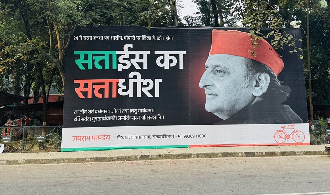 इससे पहले बुधवार सुबह समाजवादी पार्टी के लखनऊ स्थित कार्यालय के बाहर अखिलेश यादव के बड़े-बड़े पोस्टर लगाए गए थे। यह पोस्टर सपा नेता जयराम पांडे ने लगवाया है और इसमें लिखा है कि 24 में बरसा जनता का आशीष दीवारों पर लिखा है कौन होगा सत्ताइस का सत्ताधीश।