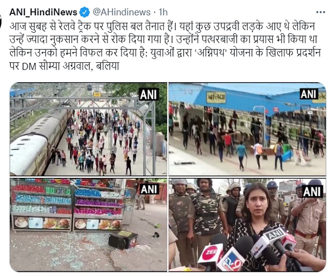 बलिया में सेना में भर्ती के लिए केंद्र सरकार की अग्निपथ योजना का विरोध कर रहे छात्रों ने शुक्रवार को बलिया में वाशिंग पिट में खड़ी ट्रेन में आग लगा दी। मुंबई से बलिया आयी स्पेशल ट्रेन (01025) की बोगी में तोड़फोड़ की। डीएम सौम्या अग्रवाल और एसपी राजकरन नय्यर स्थिति संभालने में जुटे हैं। दोनों घटनास्थल पर पहुंचे हैं। छात्रों ने शहर में भी जुलूस निकाला है। रोडवेज की दो बसों में भी तोड़फोड़ की गई है।