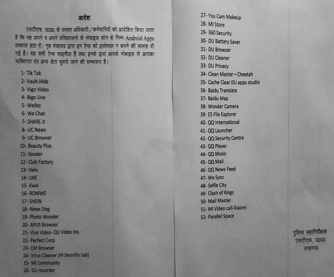 Remove Chinese Mobile Apps आइजी एसटीएफ अमिताभ यश की ओर से जारी आंतरिक आदेश में एसटीफ के अधिकारियों व कर्मियों को यह सभी एप अपने मोबाइल से हटाने को कह ...और पढ़ें