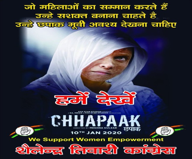 वहीं, कांग्रेस नेता शैलेन्द्र तिवारी ने इस फिल्म के समर्थन में पोस्टर छपवाएं हैं। इसमें उन्होंने लिखा कि ...जो महिलाओं का सम्मान करते हैं, उन्हें सशक्त बनाना चाहते हैं, उन्हें छपाक मूवी अवश्य देखनी चाहिए।