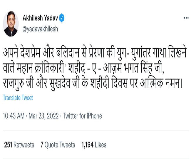 अखिलेश यादव शहीद भगत सिंह, सुखदेव, राजगुरु को किया नमन : सपा प्रमुख अखिलेश यादव ने शहीद दिवस के मौके पर स्वतंत्रता संग्राम की लड़ाई लड़ने वाले शहीद भगत सिंह, सुखदेव, राजगुरु को नमन किया। अखिलेश ने ट्वीट कर लिखा कि 'अपने देशप्रेम और बलिदान से प्रेरणा की युग- युगांतर गाथा लिखने वाले महान क्रांतिकारी' शहीद - ए - आtम भगत सिंह जी, राजगुरु जी और सुखदेव जी के शहीदी दिवस पर आत्मिक नमन।'