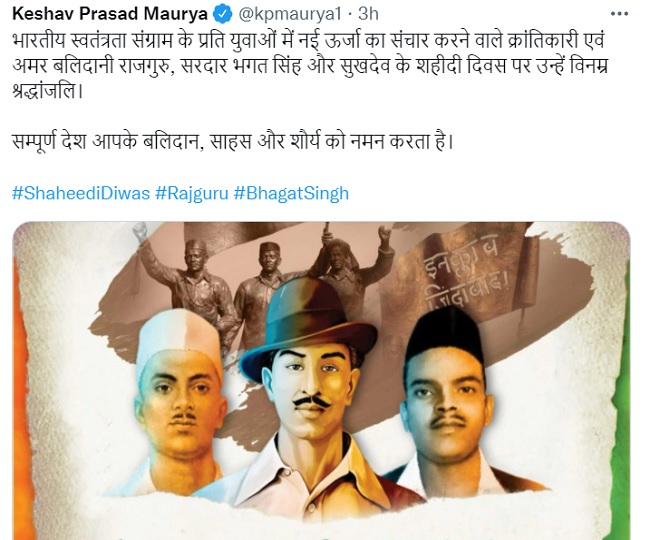 भाजपा नेता केशव प्रसाद मौर्य ने भी शहीद दिवस के मौके पर भगत सिंह, सुखदेव और राजगुरु को नमन किया। केशव प्रसाद ने ट्वीट करते हुए लिखा, 'भारतीय स्वतंत्रता संग्राम के प्रति युवाओं में नई ऊर्जा का संचार करने वाले क्रांतिकारी एवं अमर बलिदानी राजगुरु, सरदार भगत सिंह और सुखदेव के शहीदी दिवस पर उन्हें विनम्र श्रद्धांजलि। सम्पूर्ण देश आपके बलिदान, साहस और शौर्य को नमन करता है।'