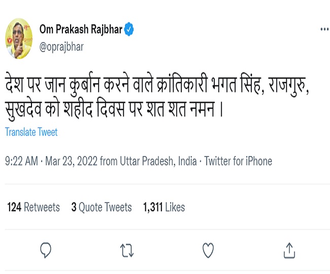 सपा नेता ओमप्रकाश राजभर ने भी शहीद दिवस पर भारत माता के वीर सपूतों को नमन किया। ओमप्रकाश राजभर ने ट्वीट करते हुए कहा कि 'देश पर जान कुर्बान करने वाले क्रांतिकारी भगत सिंह, राजगुरु, सुखदेव को शहीद दिवस पर शत शत नमन।'