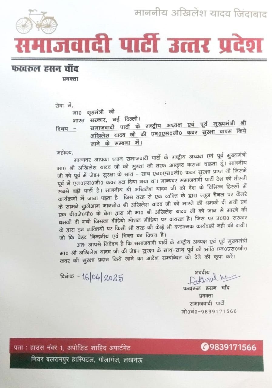 लिखा कि माननीय जी को पूर्व में जेड + सुरक्षा के साथ साथ एनएसजी कवर सुरक्षा प्राप्त थी जिसमें पूर्व में एनएसजी कवर हटा दिया गया था। समाजवादी पार्टी देश की तीसरी सबसे बड़ी पार्टी है।