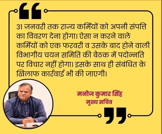 मुख्य सचिव मनोज कुमार सिंह की ओर से सभी विभागों के अपर मुख्य सचिव, प्रमुख सचिव एवं विभागाध्यक्ष को भेजे गए आदेश में कहा गया है कि 31 जनवरी तक राज्य कर्मियों को अपनी संपत्ति का विवरण देना होगा। ऐसा न करने वाले कर्मियों को एक फरवरी व उसके बाद होने वाली विभागीय चयन समिति की बैठक में पदोन्नति पर विचार नहीं होगा। इसके साथ ही संबंधित के खिलाफ कार्रवाई भी की जाएगी।