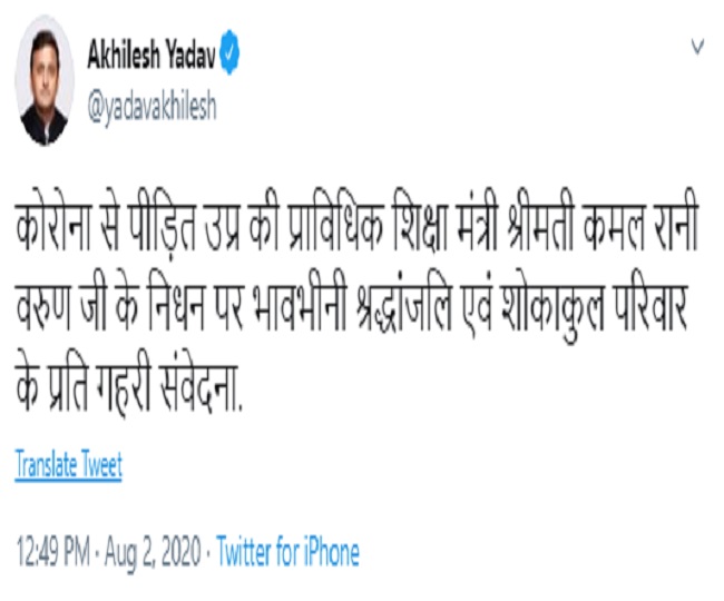 उत्तर प्रदेश के पूर्व मुख्यमंत्री अखिलेश यादव ने शोक व्यक्त करते हुए लिखा - '' कोरोनावायरस से पीड़ित उत्तर प्रदेश की प्राविधिक शिक्षा श्रीमती मंत्री कमल रानी वरुण जी के निधन पर भावभीनी श्रद्धांजलि एवं शोकाकुल परिवार के प्रति गहरी संवेदना। ''