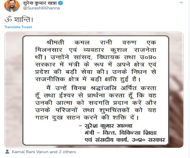 उधर, वित्त, संसदीय कार्य एवं चिकित्सा शिक्षा विभाग मंत्री सुरेश खन्ना ने ट्वीट कर विनम्र श्रद्धांजलि दी। उन्होंने लिखा- ''कमल रानी वरुण एक मिलनसार एवं व्यवहार कुशल राजनेता थीं। उन्होंने सांसद, विधायक तथा उत्तर प्रदेश सरकार में मंत्री के रूप में अपने क्षेत्र एवं प्रदेश की बड़ी सेवा की। उनके निधन से राजनीतिक क्षेत्र में बड़ी क्षति हुई है।