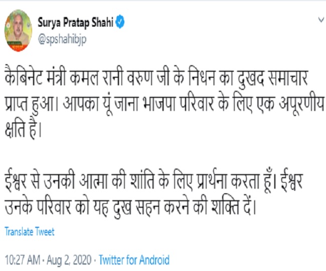 उत्तर प्रदेश सरकार के कृषि, कृषि शिक्षा एवं अनुसंधान मंत्री सूर्य प्रताप शाही ने लिखा- ''कैबिनेट मंत्री कमल रानी वरुण जी के निधन का दुखद समाचार प्राप्त हुआ। आपका यूं जाना भाजपा परिवार के लिए एक अपूरणीय क्षति है। ईश्वर से उनकी आत्मा की शांति के लिए प्रार्थना करता हूँ। ईश्वर उनके परिवार को यह दुख सहन करने की शक्ति दें।''