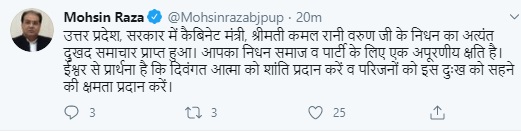 वहीं, राज्य के अल्पसंख्यक कल्याण राज्य मंत्री, मुस्लिम वक्फ और हज मंत्री मोहसिन रजा ने लिखा - ''उत्तर प्रदेश, सरकार में कैबिनेट मंत्री, श्रीमती कमल रानी वरुण जी के निधन का अत्यंत दुखद समाचार प्राप्त हुआ। आपका निधन समाज व पार्टी के लिए एक अपूरणीय क्षति है। ईश्वर से प्रार्थना है कि दिवंगत आत्मा को शांति प्रदान करें व परिजनों को इस दुःख को सहने की क्षमता प्रदान करें।''