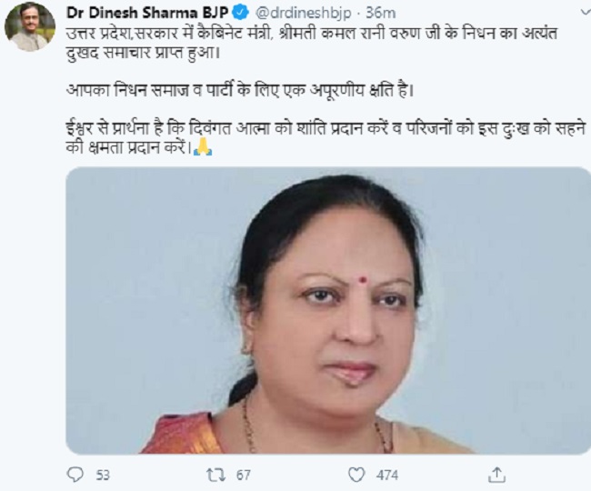 वहीं, दूसरी तरफ सोशल मीडिया ट्वीटर हैंडल पर मंत्री के निधन के बाद शोक की लहर दौड़ पड़ी। एक के बाद एक मंत्रियों ने ट्वीट कर दु:ख व्यक्त किया। उपमुख्यंत्री डॉ. दिनेश शर्मा ने ट्विटर हैंडल पर लिखा गया- ''उत्तर प्रदेश,सरकार में कैबिनेट मंत्री, श्रीमती कमल रानी वरुण जी के निधन का अत्यंत दुखद समाचार प्राप्त हुआ। आपका निधन समाज व पार्टी के लिए एक अपूरणीय क्षति है। ईश्वर से प्रार्थना है कि दिवंगत आत्मा को शांति प्रदान करें व परिजनों को इस दुःख को सहने की क्षमता प्रदान करें।''