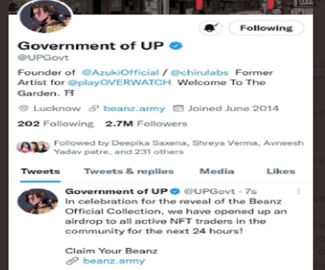 उत्तर प्रदेश के सीएम ऑफिस का ट्विटर हैंडल हैक होने के 48 घंटे के बाद यूपी गवर्नमेंट का ट्विटर हैंडल हैक किया गया है। उत्तर प्रदेश प्रशासन में सोमवार सुबह की सुबह 11 बजे के आसपास तब खलबली मची जब यूपी सरकार के आधिकारिक ट्विटर हैंडल पर हैकर्स ने कब्जा कर लिया।